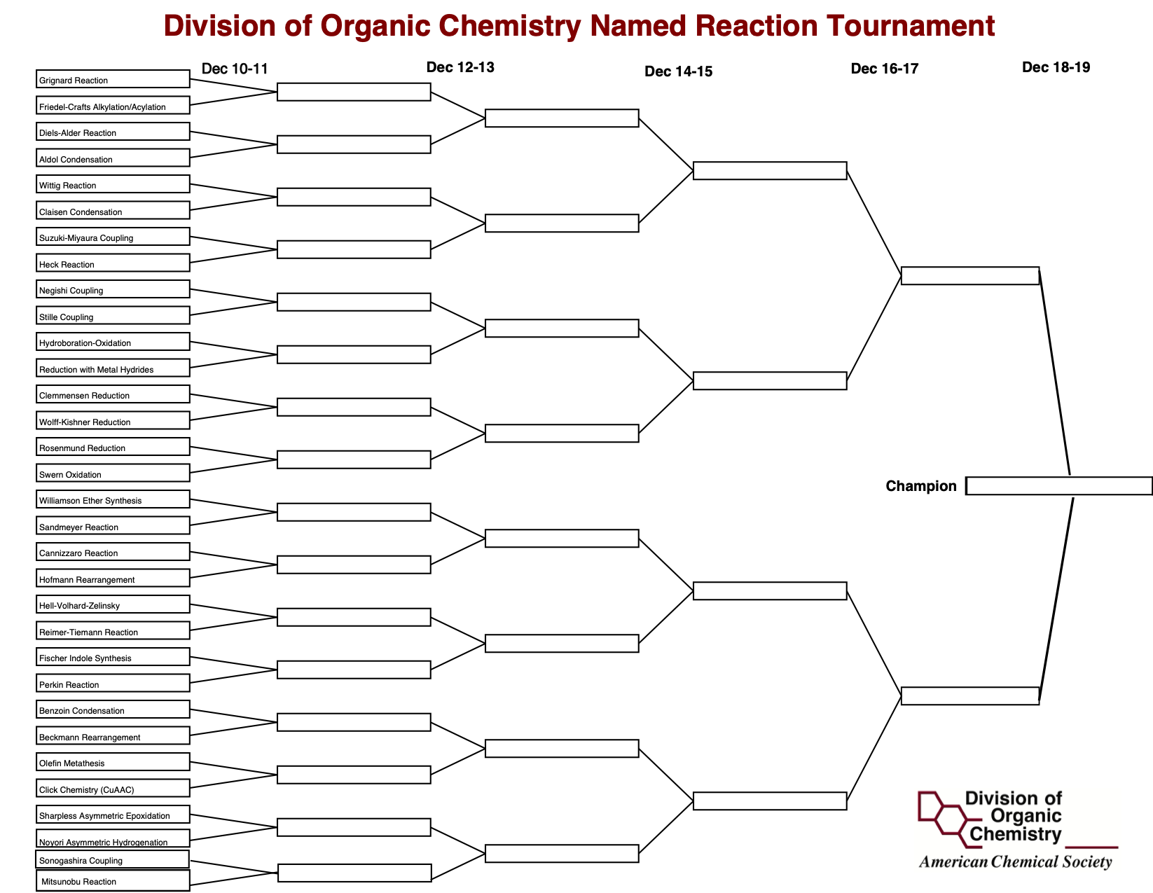 It’s tournament season in sports these days, and it is no different with us at the DOC. Several of us were arguing the other day about our favorite named reaction, and the discussion got rather animated, in no small part, due to the total subjectivity of the question. So, we decided to put it to those of you who know best – our Division members (and friends!) – and are now excited to announce the Division of Organic Chemistry Named Reaction Tournament of Champions (not to overhype it or anything). We assembled 32 named reactions, and over 5 rounds of voting by you, we will crown the “champion” named reaction over a span of 10 days, with the first round of voting on December 10-11. From then on, every two days, we will tabulate the winners of the round and move the winners to the next stage, until we crown the winner on December 19 at midnight (ET). You can vote at the DOC Reactions Tournament Page, and if you want a printable bracket, you can download that here. For each of the reactions, we included links to a description of the reaction to the wiki reference page, organicreactions.org, and organicchemistrydata.org, so feel free to share with students or others who may not have learned many named reactions yet.
